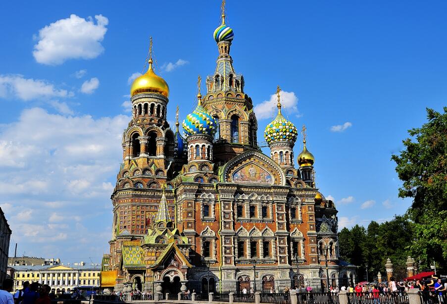 早餐后游览参观滴血教堂(外观,不少于 10 分钟),喀山大教堂(不少于 30 分钟)教堂东面竖立 94 根科尼斯式半圆型长柱长廊使喀山教堂变成典型的俄式教堂。在喀山教堂竣工后里面供奉俄罗斯最灵验的喀山圣母像,喀山圣母像曾经多次显灵。随后参观斯莫尔尼宫建筑群(外观,不少于 30 分钟)它是俄罗斯的第一座为女子而建的女子贵族中学。 【滴血大教堂】 也被称为复活教堂,建造于 1883 年至 1907 年,轮廓美丽,装饰花花绿绿,镶嵌有复杂、颜色艳丽的影像图案,用丰富的彩色图案瓷砖、搪瓷青铜板装饰,教堂顶部还立着五光十色的洋葱头顶。与古老俄罗斯风格与附近的古典式的建筑物成鲜明对比,反映了俄国十六和十七世纪的典型的东正教教堂建筑风格。  【喀山大教堂 】 这个建筑的平面图呈十字型中间上方是一个圆筒型的顶楼,顶楼上是一个端正的圆顶。半圆型的柱廊由 94 根圆柱组成,面向大街,环抱广场。但是由于教堂的正门面向北方,侧面面临涅瓦大街很不美观。  【斯莫尔尼宫建筑群】它建于 1806—1808 年,原为贵族女子学院。“斯莫尔尼”一词来自俄语“沥青”,初建时这里属于沥青厂。斯莫尔尼宫位于圣彼得堡市中心整体色彩和皇村的叶卡捷琳娜宫的色彩一样,也是清爽干净的蓝白相间,是巴洛克风格和俄罗斯风格的融合,在圣彼得堡的教堂里,相当具有代表性。